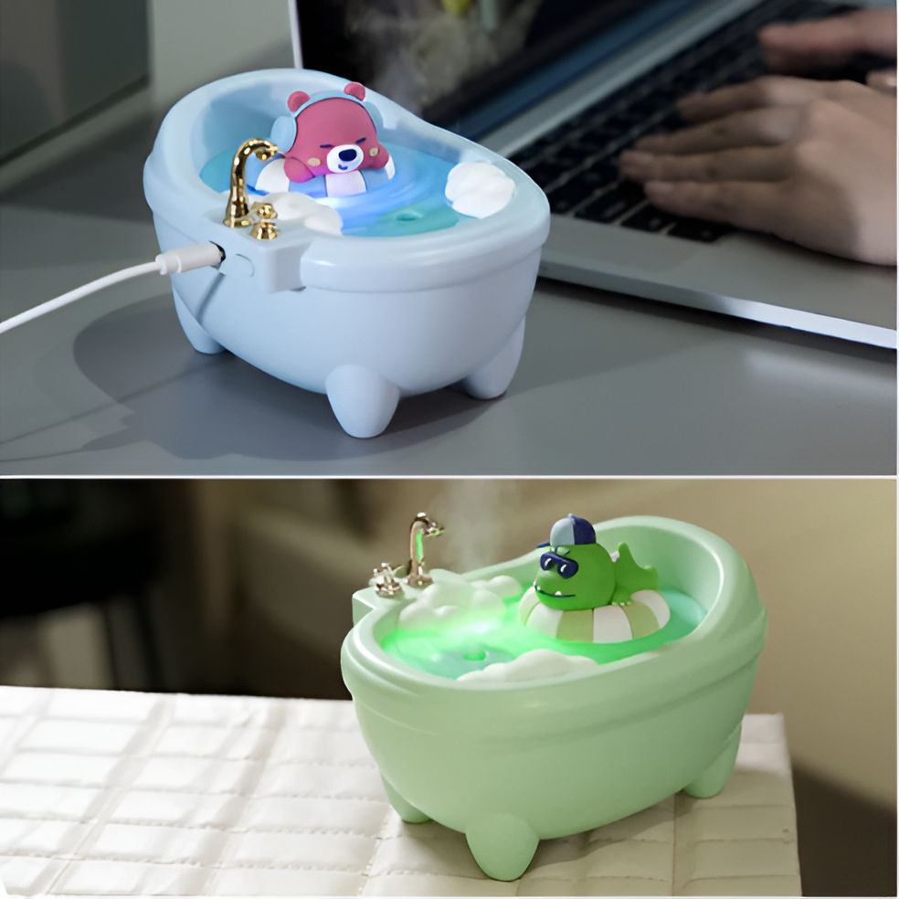 Add a splash of personality and functionality to your space with our USB-powered humidifier and small night lamp combo! Designed with a unique vase-like appearance, this versatile device adds just the right touch to any room. Choose from charming styles, including a purple coconut tree, red cherry tree, green cactus, blue pine, and adorable bathtub designs featuring cute animal figures like a duck, rabbit, dragon, and bear. Each humidifier emits a soft, ambient glow and a gentle mist, creating a cozy and relaxing atmosphere.